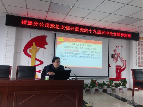 12月1日下午,橋靠分公司黨總支邀請市委黨校黨史黨建教研室主任李恩巍教授宣講黨的十九屆五中全會精神。分公司黨員、預(yù)備黨員、發(fā)展對象、積極分子、環(huán)節(jié)干部在黨員活動中心聆聽學(xué)習(xí)宣講。