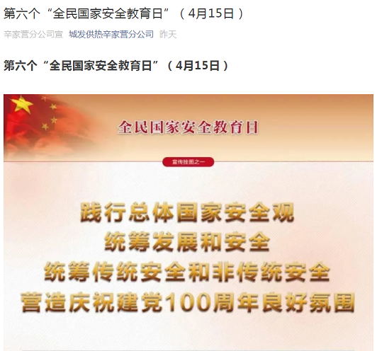 4月15日是法定全面國家安全教育日,今年是我國第6個(gè)全面國家安全教育日,主題是“踐行總體國家安全觀,統(tǒng)籌發(fā)展和安全,統(tǒng)籌傳統(tǒng)安全和非傳統(tǒng)安全,營造慶祝建黨100周年良好氛圍”,城發(fā)供熱辛家營分公司黨支部積極開展全民國家安全教育日宣傳教育活動(dòng),切實(shí)增強(qiáng)全體干部職工的國家安全意識(shí)。