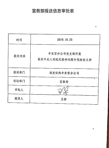 2019年1月1日—2019年10月底,辛家營(yíng)分公司黨支部組織開(kāi)展領(lǐng)導(dǎo)干部落實(shí)中央八項(xiàng)規(guī)定精神問(wèn)題專(zhuān)項(xiàng)排查工作。
