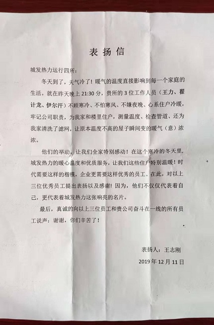 “在這個寒冷的冬天里,城發(fā)熱力的暖心溫度和優(yōu)質服務,讓我們這些住戶特別溫暖!” 12月19日,城發(fā)供熱辛家營分公司運營四所收到了陽光美居住戶王先生送來的感謝信,感謝運行人員切實解決了不熱問題。