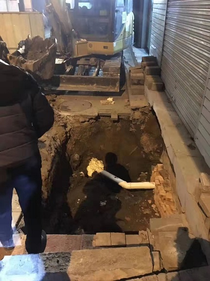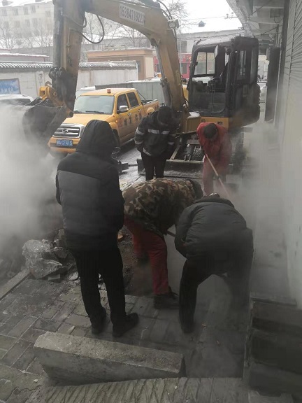 現(xiàn)場(chǎng)發(fā)現(xiàn),由于因管道老化破損導(dǎo)致漏水,臨時(shí)堵漏的抱卡已不足以承受一次網(wǎng)的高溫高壓,考慮到當(dāng)天氣溫低,為了保障所在區(qū)域用戶供暖不受影響,領(lǐng)導(dǎo)和技術(shù)人員現(xiàn)場(chǎng)指揮決定暫不停暖,先開挖,同時(shí)為搶修做好充分準(zhǔn)備。搶修人員在寒風(fēng)刺骨的冬日為搶修做前期準(zhǔn)備工作。