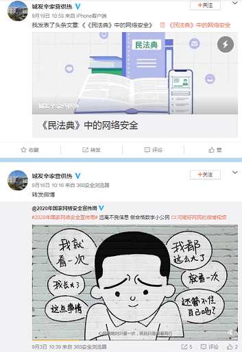 在國家網(wǎng)絡安全宣傳周活動期間,分公司通過微信公眾號平臺每日推送至少一個有關網(wǎng)絡安全宣傳的微視頻,官方微博同步轉載相關微視頻、海報。利用LED滾動屏推送網(wǎng)絡安全宣傳活動主題,形成以線上宣傳為主,線下宣傳為輔的良好宣傳氛圍。在突出了網(wǎng)絡安全重要性的同時,使大家牢固樹立了依法文明用網(wǎng)、安全用網(wǎng)的網(wǎng)絡安全意識,營造了人人參與維護網(wǎng)絡安全的良好氛圍。