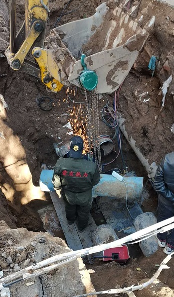 開挖后發(fā)現(xiàn)是一次網(wǎng)DN300管線的固定墩焊口處漏水,經(jīng)研究決定,更換一次網(wǎng)固定墩。因現(xiàn)場(chǎng)水量很大,多次發(fā)生塌方,給施工帶來很大的困難,但供暖在即,所有施工人員全力配合連夜搶修,最終在15日下午搶修完畢,恢復(fù)供熱。