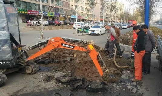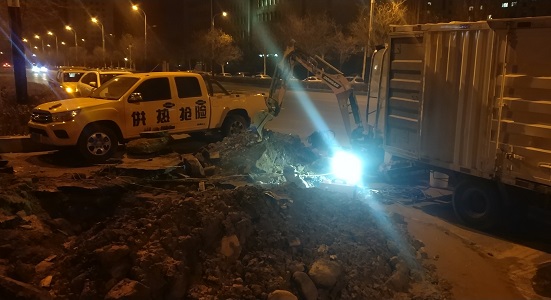 11月11日上午8時,金橋分公司巡線人員在巡線時發(fā)現(xiàn)司法廳小區(qū)供熱管網(wǎng)在橫穿包頭大街處有跑水現(xiàn)象。金橋分公司立即啟動搶修應(yīng)急預(yù)案并第一時間組織人員搶修,上午10時,開始搶修。開挖路面后發(fā)現(xiàn)路面翻水處并非管道漏水點,無法確定實際漏水點,大大增加了搶修難度。施工現(xiàn)場生產(chǎn)處和運營所相關(guān)人員通過路面鉆孔、聽針定位的方式最終確定了失水點的位置。于18時找到兩處失水點,22時,失水點全部修復(fù)完成。開始打壓試水。經(jīng)過14個小時不間斷的連續(xù)奮戰(zhàn),于12日凌晨1時司法廳小區(qū)全部恢復(fù)正常供熱。