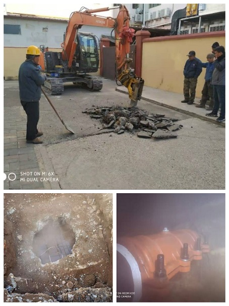 在大致確定位置后,10點掘機入場進行破路,泄水、抽水、不到一小時找到失水點。所長額爾頓圖和檢修主任楊在霖第一時間到達現(xiàn)場制定施工方案。確定搶修方式為DN125管道打卡修復(fù)。