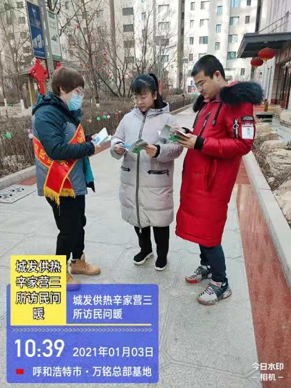 1月3日,辛家營(yíng)分公司開(kāi)展了2020-2021年度第十三次“訪民問(wèn)暖”專項(xiàng)活動(dòng)。分公司客戶服務(wù)處、運(yùn)營(yíng)二所和運(yùn)營(yíng)三所全體工作人員組成“訪民問(wèn)暖”小組,走進(jìn)了轄區(qū)內(nèi)奈倫國(guó)際和萬(wàn)銘總部基地,共走訪用戶36戶,現(xiàn)場(chǎng)為19戶解決問(wèn)題,填寫了《訪民問(wèn)暖記錄表》36份、《居民供熱問(wèn)卷調(diào)查表》18份、發(fā)放城發(fā)供熱服務(wù)手冊(cè)16本。