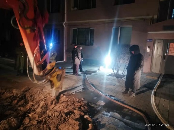 副經(jīng)理張國梁、運營所長馮俊、檢修主任賈超及保駕單位第一時間趕往漏水現(xiàn)場。此時天色已晚,由于室外氣溫較低,如果安排連夜搶修,將影響約43萬平方米的用戶正常用熱,決定次日進行搶修。