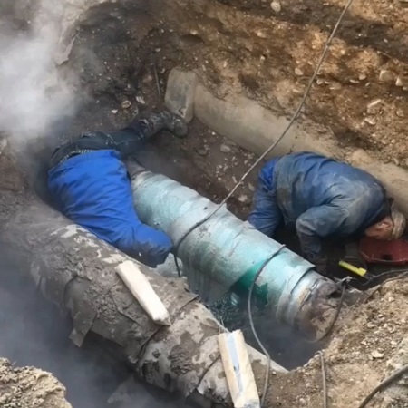 隨著挖掘機不間斷的挖掘,抽水機將井室積水抽出,上午11點漏水點慢慢浮出水面,發(fā)現(xiàn)是一次網(wǎng)DN300供水補償器因年久腐蝕破裂。現(xiàn)場決定更換一臺新的補償器,確定搶修方案后,檢修人員在站內(nèi)泄水。為了能盡快恢復(fù)供熱,檢修人員頂著刺骨的寒風(fēng)在泥濘的坑道內(nèi)加緊作業(yè),全然不顧身上的衣服已經(jīng)濕透。