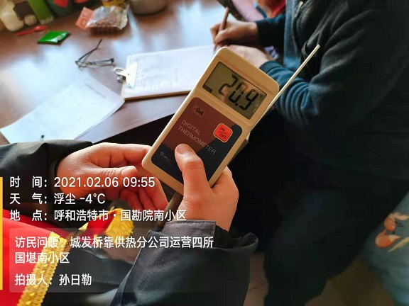 臨近春節(jié),橋靠分公司運(yùn)營(yíng)四所一線工作人員,對(duì)轄區(qū)內(nèi)老舊小區(qū)的供熱情況進(jìn)行了走訪,并對(duì)還未交費(fèi)的用戶逐戶入戶,上門(mén)進(jìn)行催費(fèi),張貼到訪不遇單及催費(fèi)單。在走訪中,未發(fā)現(xiàn)有溫度不達(dá)標(biāo)用戶,所走訪的用戶對(duì)室內(nèi)溫度很滿意,經(jīng)過(guò)測(cè)溫,平均溫度為21℃。