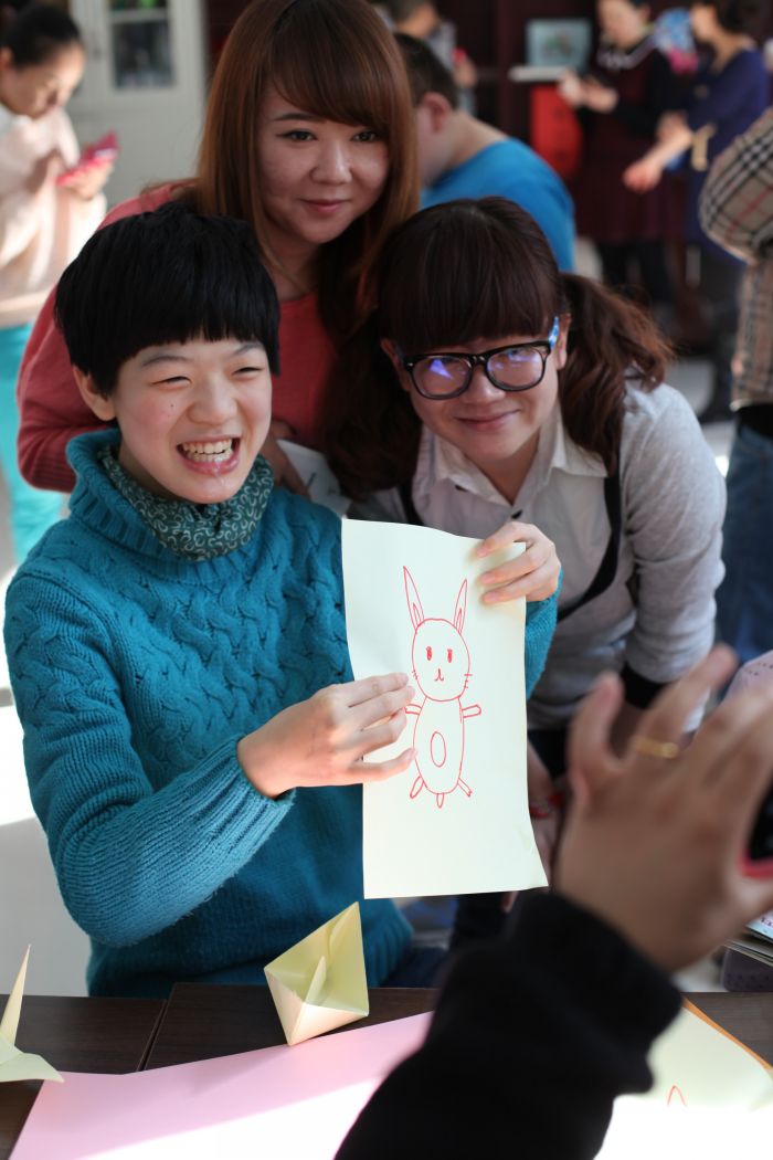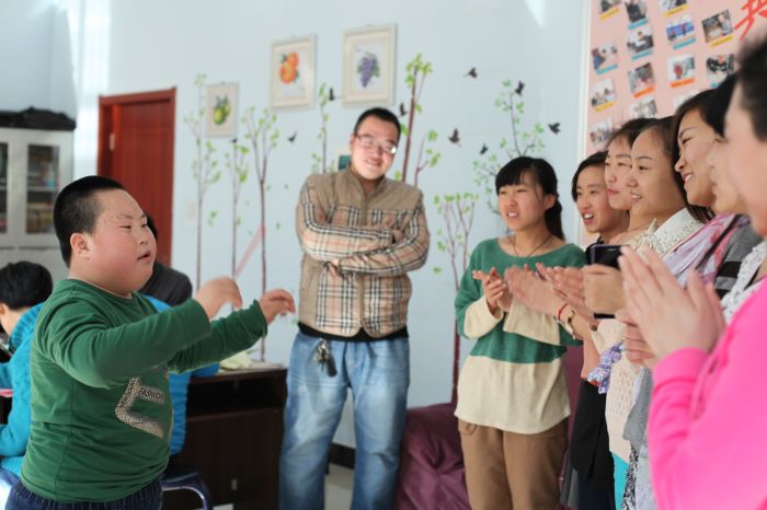 一行20余名青年志愿者們在學校老師的支持與配合下,順利開始了活動。志愿者們?yōu)楹⒆觽儼俗類鄢缘娘溩?,他們還牽起智障兒童的小手,帶領他們參加互動游戲,和他們一起做手工、繪畫,身體力行地詮釋“點滴關愛,心暖世界”的理念。交流讓他們成為朋友,歌聲傳達了他們的愛,活動感動他們也感動了我們。我們采取一對一的方式的交流,聽著他們開心的笑聲,在場的志愿者們都露出會心的微笑。一首志愿者們精心挑選的《敢問路在何方》是希望小朋友們做勇敢的強者。演唱中小朋友表情頗為認真的為演唱的志愿者們指揮節(jié)奏。他們用行動告訴我們,他們很快樂。