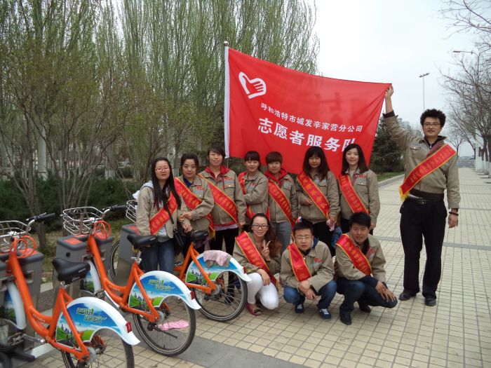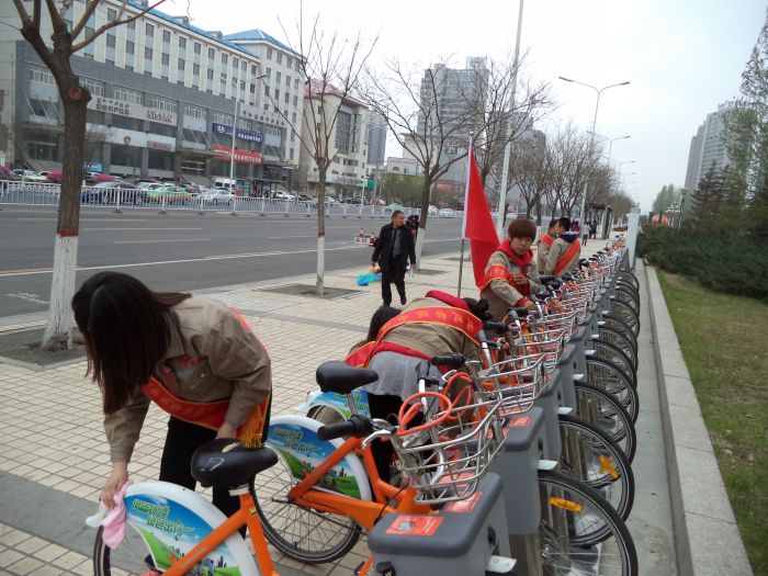 上午九點(diǎn)半,在團(tuán)支部的帶領(lǐng)下,由分公司各部門的12名在崗青年團(tuán)員組成的志愿者服務(wù)隊(duì),來到呼和浩特市公用自行車的三個(gè)停放點(diǎn):市政府停放點(diǎn)、第二十九中停放點(diǎn)、巨海九區(qū)停放點(diǎn)。對其三個(gè)停放點(diǎn)自行車的衛(wèi)生進(jìn)行清掃,清掃的主要任務(wù)是:車輛的擺放整齊、自行車和讀卡機(jī)表面的擦拭、停放點(diǎn)周邊環(huán)境的清掃等。