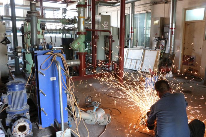 室內(nèi)裝修工作已經(jīng)路線展開。圖為施工人員正在切割管件。