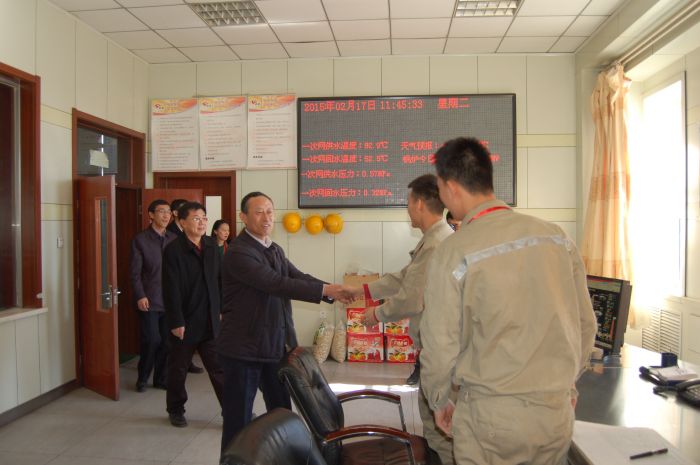臘月二十九,黨委書記、總經(jīng)理張瑞平,黨委副書記、工會主席張永,黨委委員、副董事長杜雄勇,黨委委員、副總經(jīng)理史繼文4人率隊,分別到四個供熱分公司,深入車間、運營所、收費大廳、熱力站,對一線員工進(jìn)行了慰問。(文/亞利)