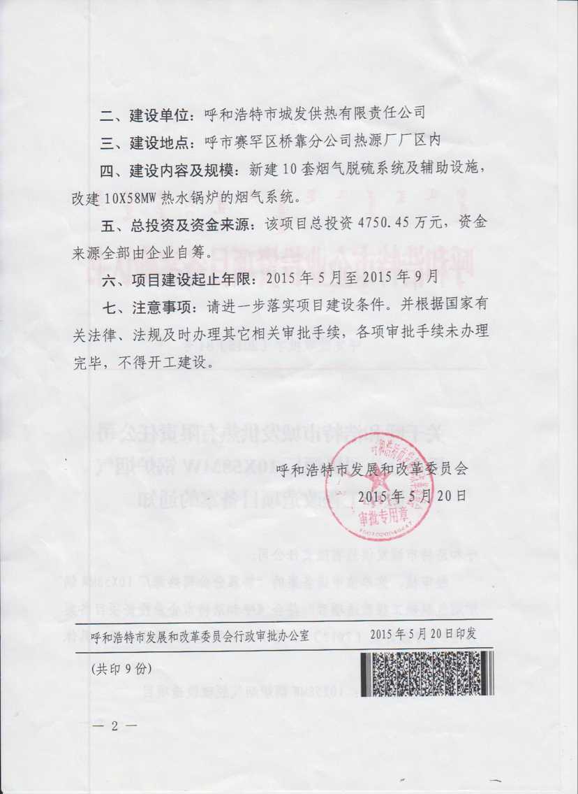 呼市發(fā)改委關于橋靠熱源廠脫硫項目的備案確認書