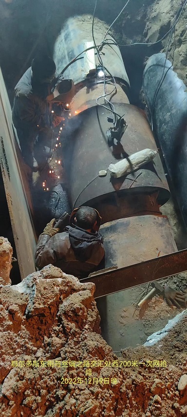 12月8日晚,位于鄂爾多斯東街與絲綢之路交匯處西200米路南公交站牌有熱氣冒出,確定為DN700一次網(wǎng)主管道發(fā)生泄漏,決定延用對(duì)補(bǔ)償器“包封”的辦法處理漏點(diǎn)。搶修工作于10日凌晨五點(diǎn)完工,又一次成功實(shí)現(xiàn)了搶修不停供。