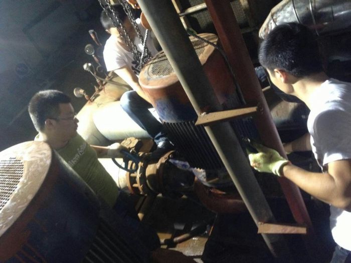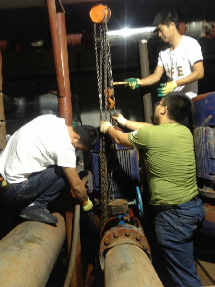 到達(dá)現(xiàn)場(chǎng),先將機(jī)組斷電,確保安全后,將吊鏈掛在龍門架上,下端連接好循環(huán)泵。由于站內(nèi)設(shè)備、管道布局復(fù)雜、緊湊,泵體周圍能夠作業(yè)的空間非常有限,我們只能弓著身子去將泵體與底座間的螺絲拿扳手一個(gè)個(gè)擰下來,然后用吊鏈將泵體吊起后放倒,依次將葉輪、支撐蓋等部件取下,把損壞的機(jī)封拆解下來。給新的機(jī)封上少許潤(rùn)滑油,后將其準(zhǔn)確無誤的安裝到指定位置,再將拆解下去的部件依次安裝上去,將泵體與底座連接,用螺絲緊到位。檢查一下風(fēng)扇是否轉(zhuǎn)動(dòng)自如,然后啟動(dòng)循環(huán)泵,觀察其是否漏水,各個(gè)部件是否運(yùn)轉(zhuǎn)正常??雌饋硪磺羞\(yùn)轉(zhuǎn)正常后,才結(jié)束了今天的檢修。