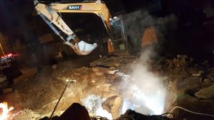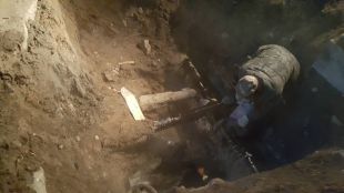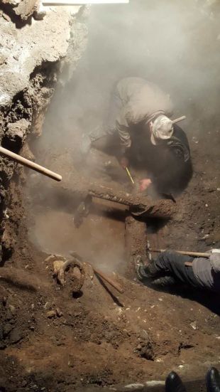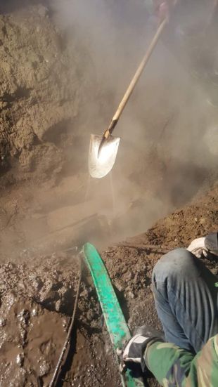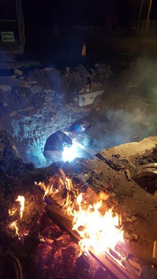 下午2點,開始挖坑找漏點,邊抽水邊挖,挖出熱力管道。分公司經(jīng)理阮強、副經(jīng)理陳龍到達(dá)現(xiàn)場指示:去除保溫,找到漏點。隨即檢修人員關(guān)掉統(tǒng)計局街西端DN300閥門,準(zhǔn)備泄水搶修。由于閥門關(guān)閉不嚴(yán),水溫太高,人工無法繼續(xù)開挖,只能調(diào)來挖機進(jìn)行搶修作業(yè)。經(jīng)過2小時的人機配合,終于挖出管道 ,發(fā)現(xiàn)在供熱管上方有一大一小兩個漏點,局部腐蝕嚴(yán)重。經(jīng)過商議,確定在在原有管道上加套管,帶水焊接。